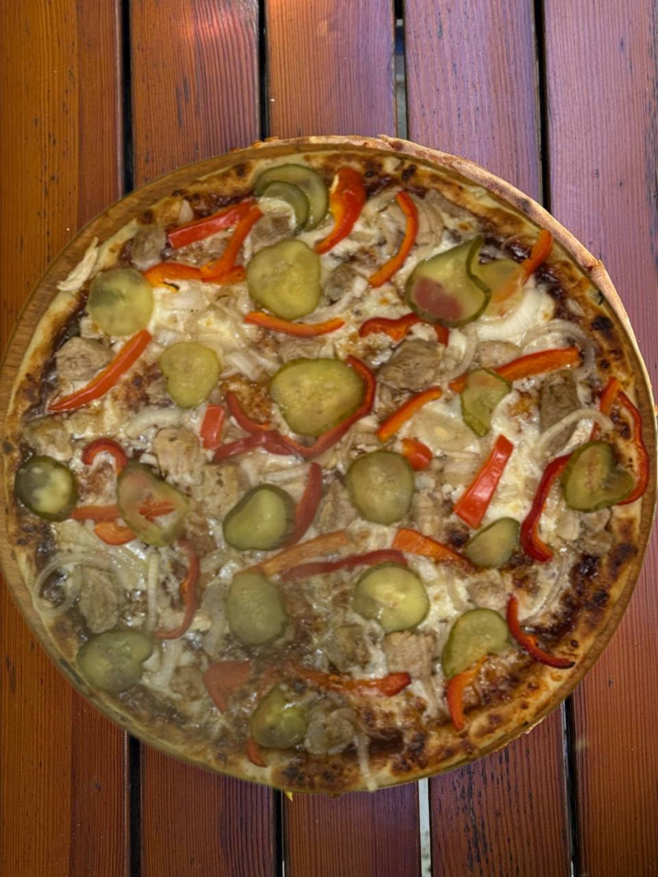 Соус BBQ, моцарела, свинина, яловичина, перець болгарський, огірок маринований, лук маринований.