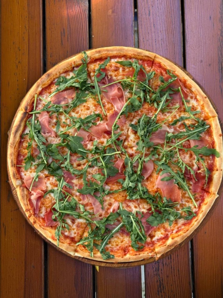 Моцарела, шинка, бекон, салямі, печериці, ананас, перец болгарський, помідори, цибуля маринована.